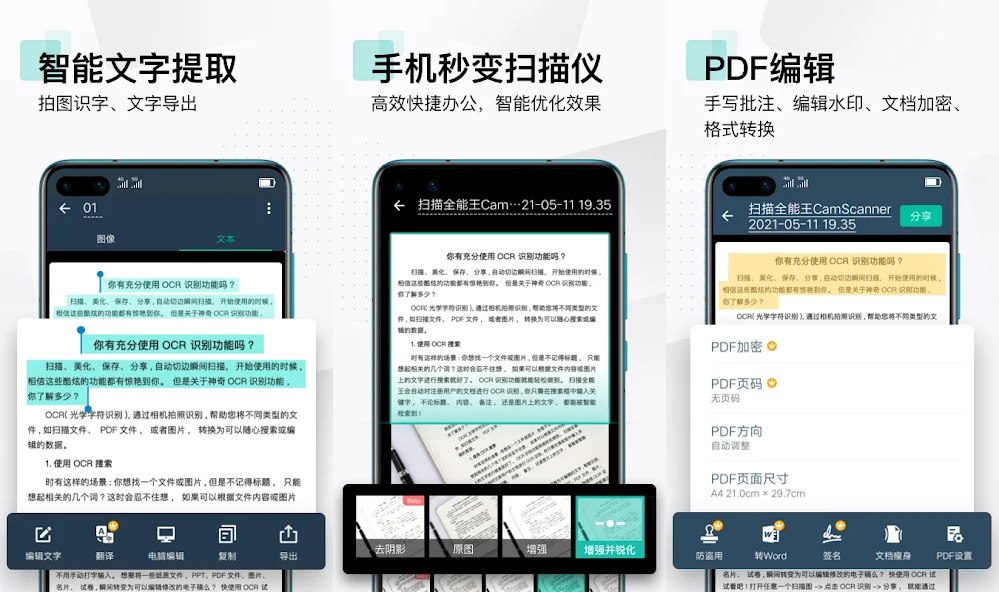 扫描全能王(CamScanner),全球智能扫描引领者。扫描全能王是一款集文件扫描、识别翻译、图片文字提取识别PDF文档编辑、PDF加密、PDF转Word文档转换、文档防盗、电子签名等功能于一体的多功能智能扫描仪软件。OCR识别,自动扫描,自动切边,图像美化,生成高清扫描件,还能将扫描件一键转换Word/Excel/ PPT等多种格式文档,通过文档共享协作平台多设备同步查看,支持无线打印,全球传真。