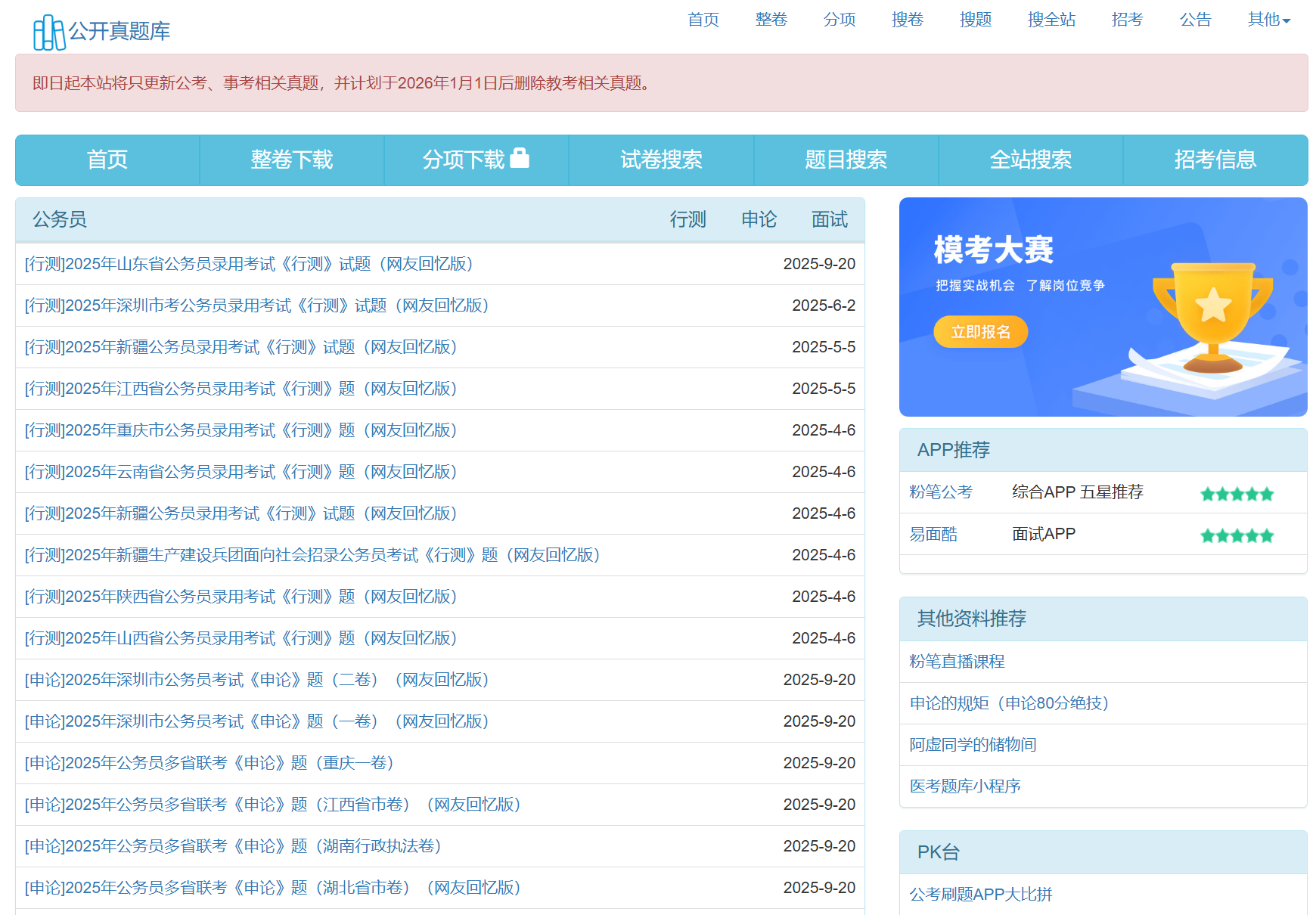 公开真题库是一个专注于分享公务员、事业单位考试真题的网站。包含行测、申论、面试、综合基础知识、职能测试等,支持在线打印和下载,支持查看答案和解析,虽然提供付费服务,但是绝大部分功能都是对访客开放的,无需注册即可使用和下载。