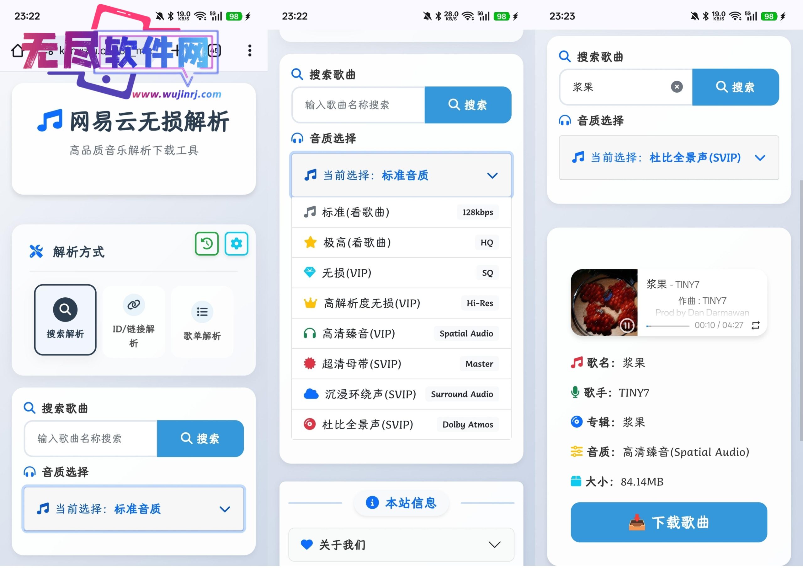 这是一个免费的网易云音乐的高品质歌曲解析和下载工具的网站。可以通过搜索歌曲、ID或链接来获取所需音乐。支持多种音质格式,包括FLAC、Hi-Res和杜比全景声等。